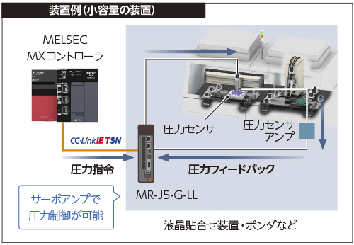 圧力センサ (ロードセル*1) のアナログ信号をMR-J5-G-LLに取り込み、圧力制御を行います。負荷が変動しても脈動の少ない圧力保持が可能です。圧力モデル適応制御を使用しており、押し込みを抑えつつ、高応答な圧力制御が可能です。