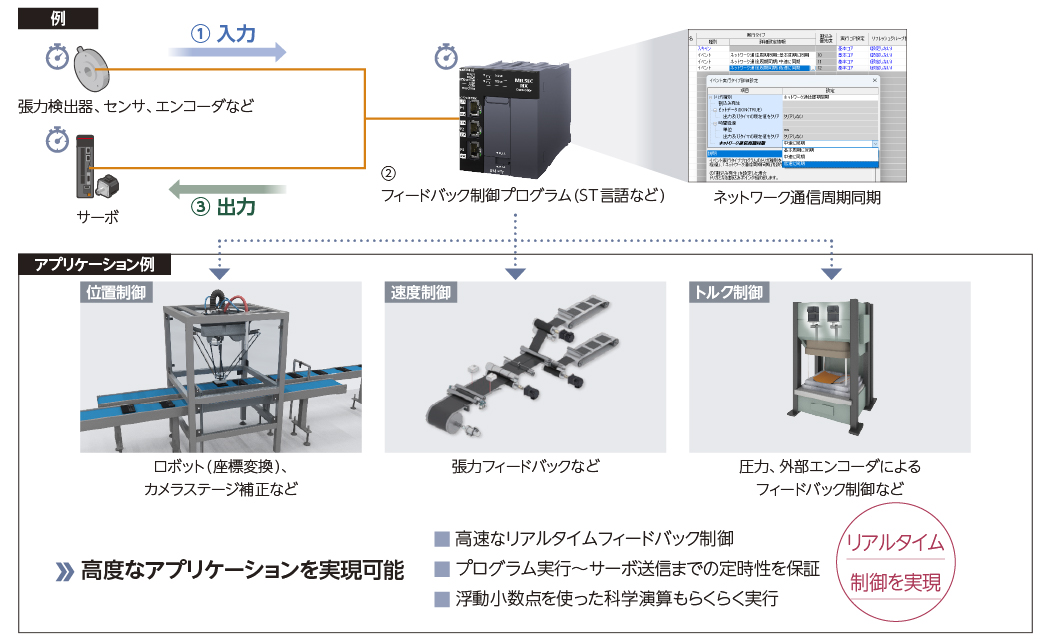 これらにより、プログラム実行~モーション演算~ネットワーク送受信の全てが同一の通信周期で実行されるため、ユーザプログラムで制御指令をリアルタイムに生成し、センサの値を駆動機器に即時伝達させるような高度な制御ループを実現できます。
