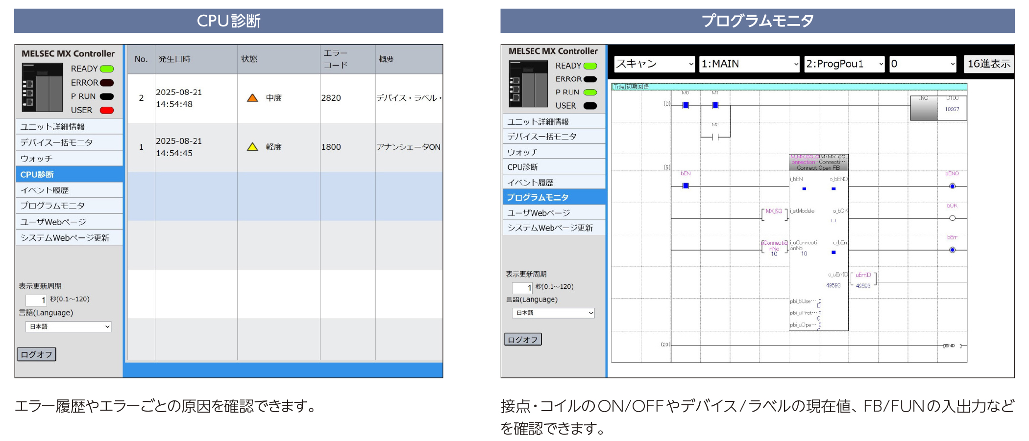 エラー内容やプログラムの動作状態、デバイスの状態などをブラウザ上で確認できるため、トラブル発生時の一次判断を素早く行うことができます。現地調査前に簡易診断で十分に準備できるため、効率よくメンテナンスできます。