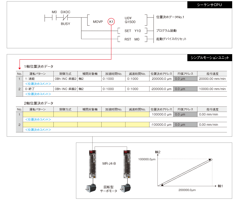 - 手軽に位置決めアドレス、速度などをシーケンスプログラムから設定して自動運転ができます。