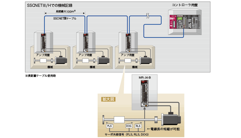 1系統あたり最大1600m(局間最大100m×16軸)の長距離配線が可能 - SSCNETⅢ/H対応品とSSCNETⅢ対応品との混在が可能