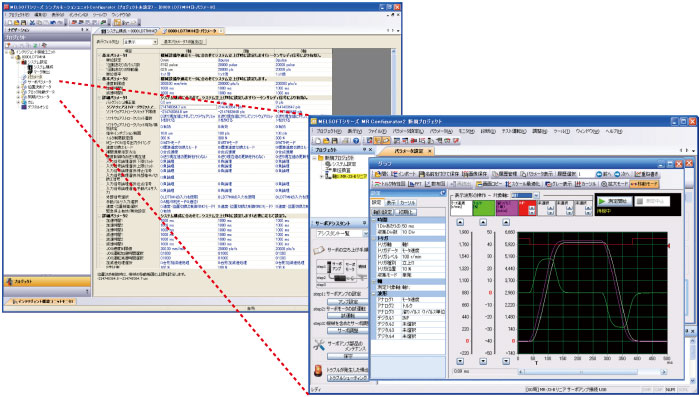サーボアンプのパラメータ設定や調整は、シーケンサ経由のセットアップソフトウェアMR Configurator2で簡単に行えます。