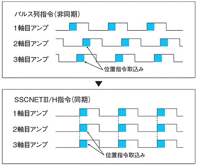 SSCNETⅢ/Hでは、完全同期通信が可能。高精度な同期が必要な装置の高性能化を実現します。