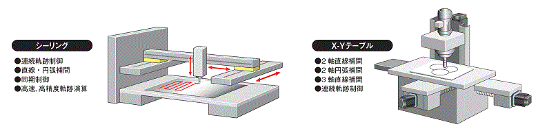 • 直線補間制御、2軸円弧補間制御、定寸送り制御、現在値変更、および連続軌跡制御など豊富な制御で様々な用途に対応できます。
