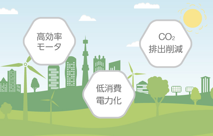 - PMモータなどの高効率モータ駆動、待機電力の削減などにより、ランニングコスト削減、CO2削減に貢献します。