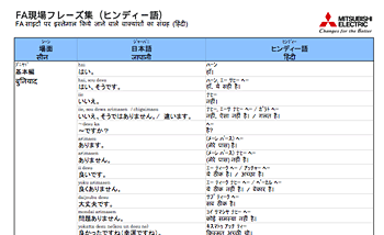 生産現場でよく用いられるフレーズを場面別(設計・製造・保守等)に整理し、 FA現場フレーズ集 (ヒンディー語、グジャラート語、カンナダ語、タミル語、英語等)に纏めました。現地スタッフとのスムーズなコミュニケーションの一助としてご利用ください。