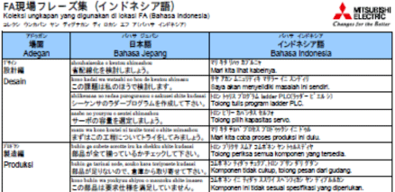 生産現場でよく用いられるフレーズを場面別(設計・製造・保守等)に整理し、 FA現場フレーズ集 に纏めました。現地スタッフとのインドネシア語、英語他でのスムーズなコミュニケーションの一助としてご利用ください。