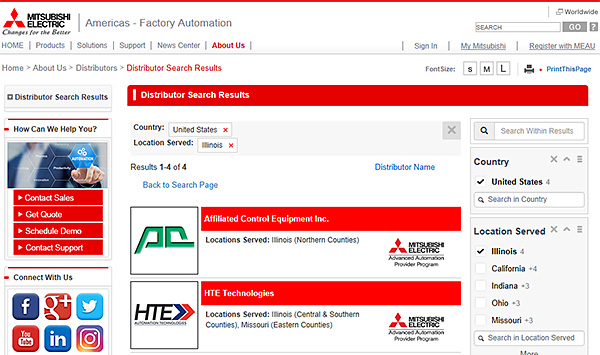 MITSUBISHI ELECTRIC AUTOMATION. INC. ウェブサイトから、ご要望のロケーション・機種に応じた最適な代理店を検索頂けます。