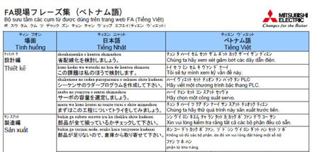 生産現場でよく用いられるフレーズを場面別(設計・製造・保守等)に整理し、 FA現場フレーズ集 に纏めました。ベトナム語、英語での現地スタッフとのスムーズなコミュニケーションの一助としてご利用ください。