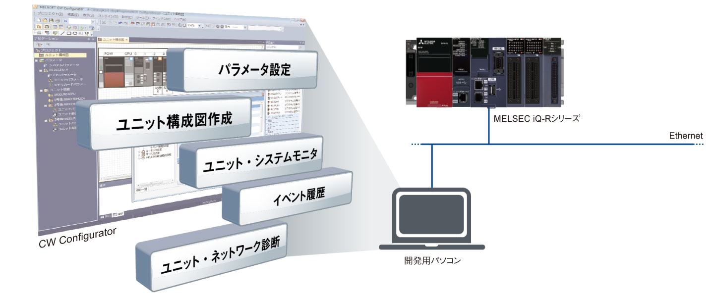 C言語コントローラユニットをはじめとする、MELSEC iQ-R/Qシリーズの各種ユニット*1(ネットワークユニット、インテリジェント機能ユニット、入出力ユニットなど)のパラメータ設定・診断・モニタ・テストを、CW Configuratorを使って簡単に行えます。また、CW Configuratorは、MELSEC iQ-R用プログラミングソフトウェアGX Works3と同様の操作性で使用できます。
