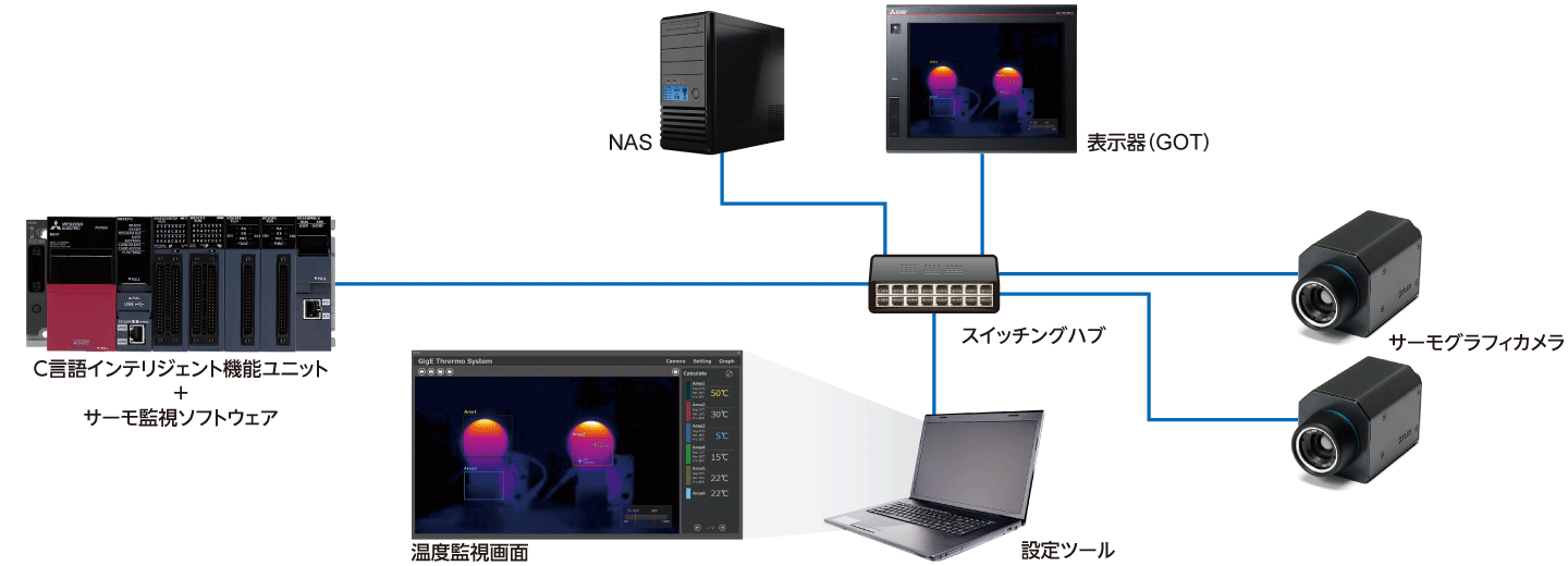 スイッチングハブを経由して、MELSEC iQ-Rシリーズシーケンサとサーモグラフィカメラを直接接続できます。また、設定ツール(パソコン)、表示器(GOT)、NASなども接続でき、サーモグラフィカメラが検出した温度情報や、温度画像に変換したデータをFTPサーバーへ送付できます。