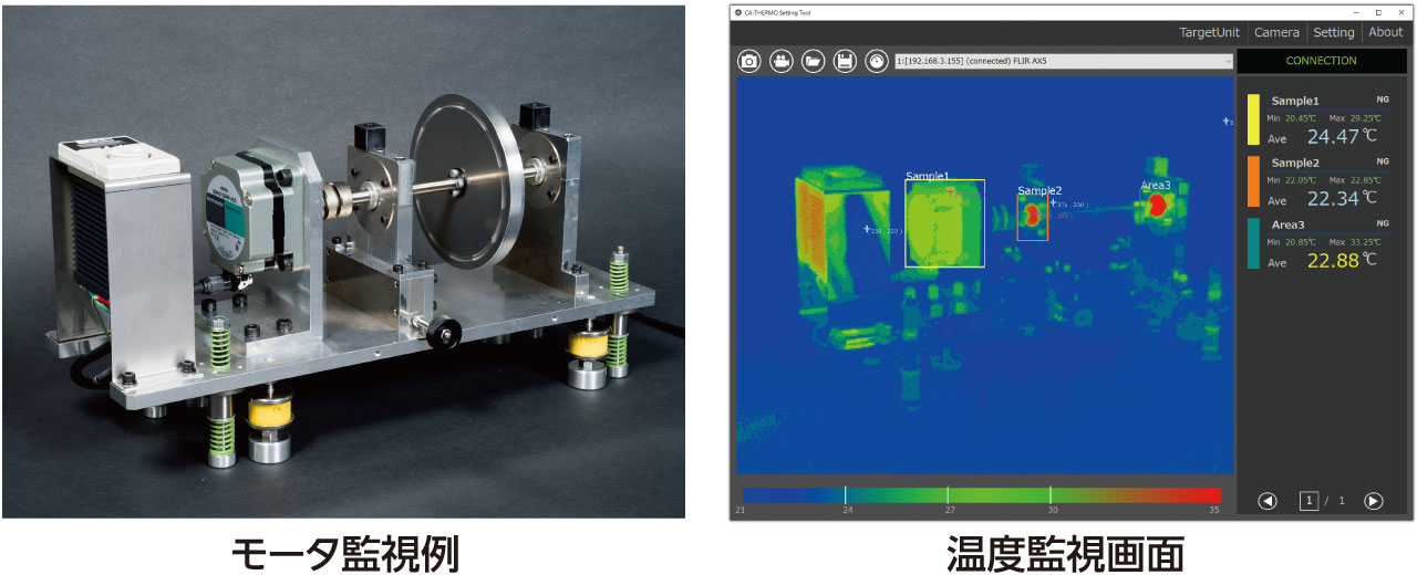 サーモグラフィカメラによる撮影で、温度計が配置できない対象物でも温度測定が可能です。また、広範囲の測定を線や面で行えるため、複数点同時に測定もできます。 - 温度監視エリアごとに温度情報、温度面積のデータを取得