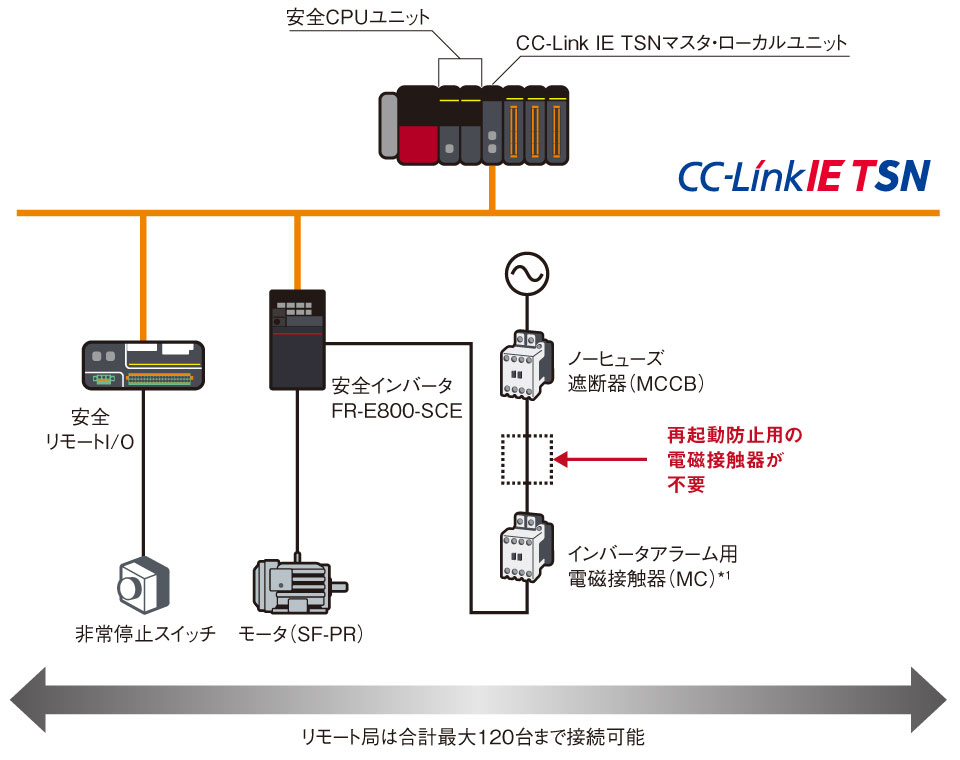 インバータ FR-E800-SCEは、安全機能を標準搭載しています。一般通信用機器と安全通信用機器を別々に用意する必要はありません。