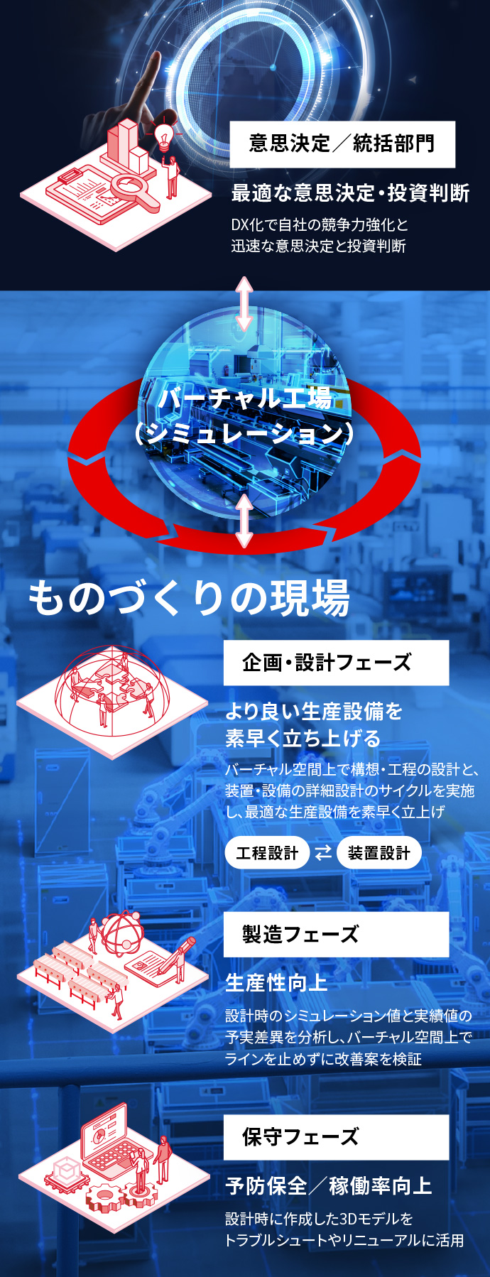 各工程の改善だけではなく、構築したバーチャル工場がハブとなり