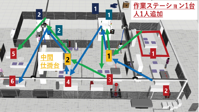 • 3Dシミュレーションによって、ラインを停めずにバーチャル空間上で好きなだけ改善案を試せた。