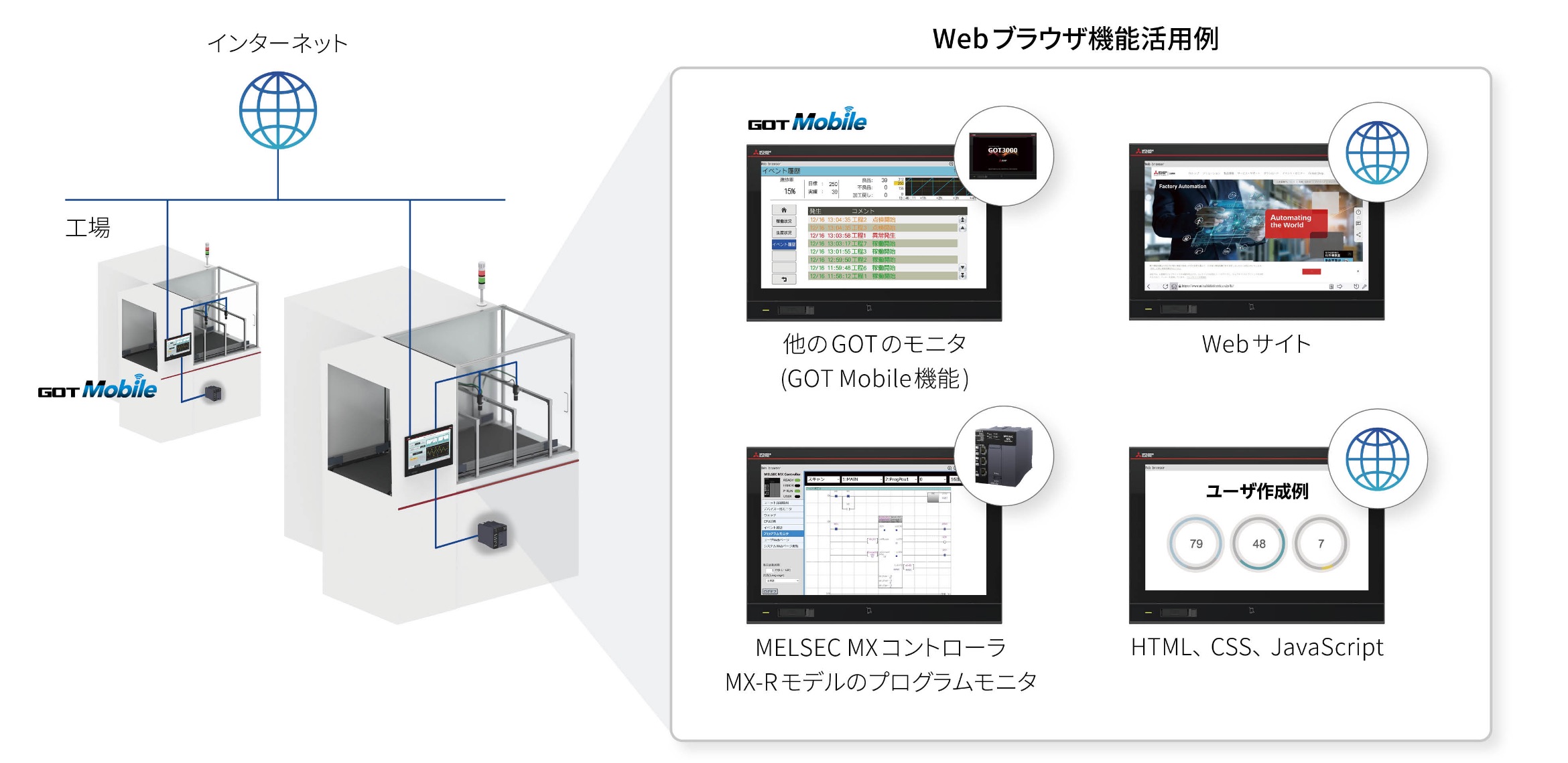 GOT3000はWebブラウザ機能を搭載しており、GOT Mobile機能を使って他のGOTをモニタできます。さらに、接続機器がWebサーバ機能を持っていれば、PCやタブレットを持ち込むことなくブラウザ上でトラブル発生時の一次対応を迅速に行えます。もちろん、Webサイトの閲覧も可能です。